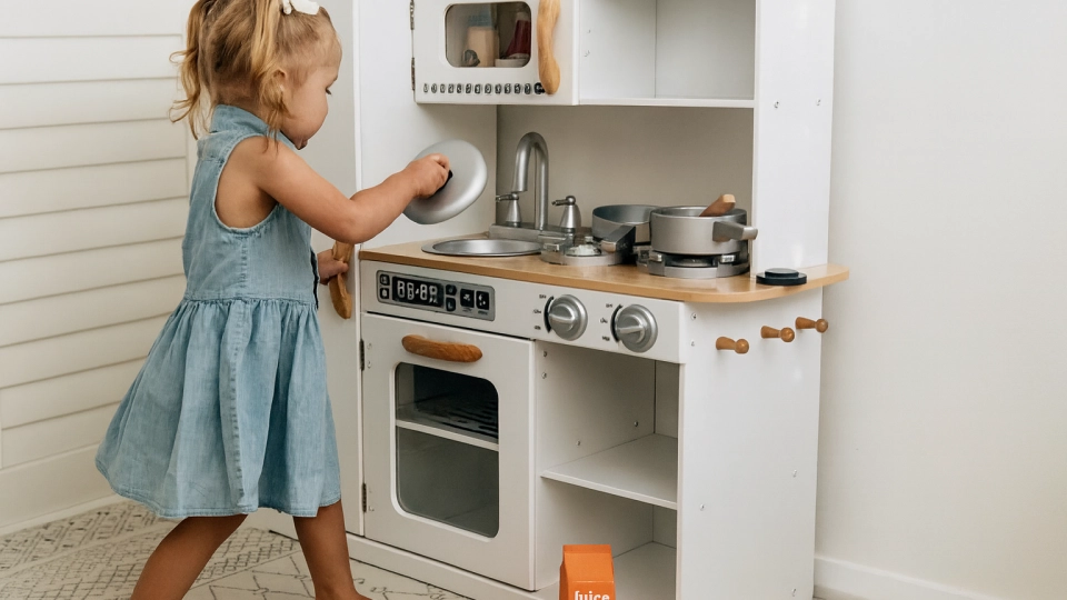 Let ook op de veiligheid: het keukentje moet stabiel zijn, zonder scherpe randen, en bij voorkeur van kwalitatief en onschadelijk materiaal.