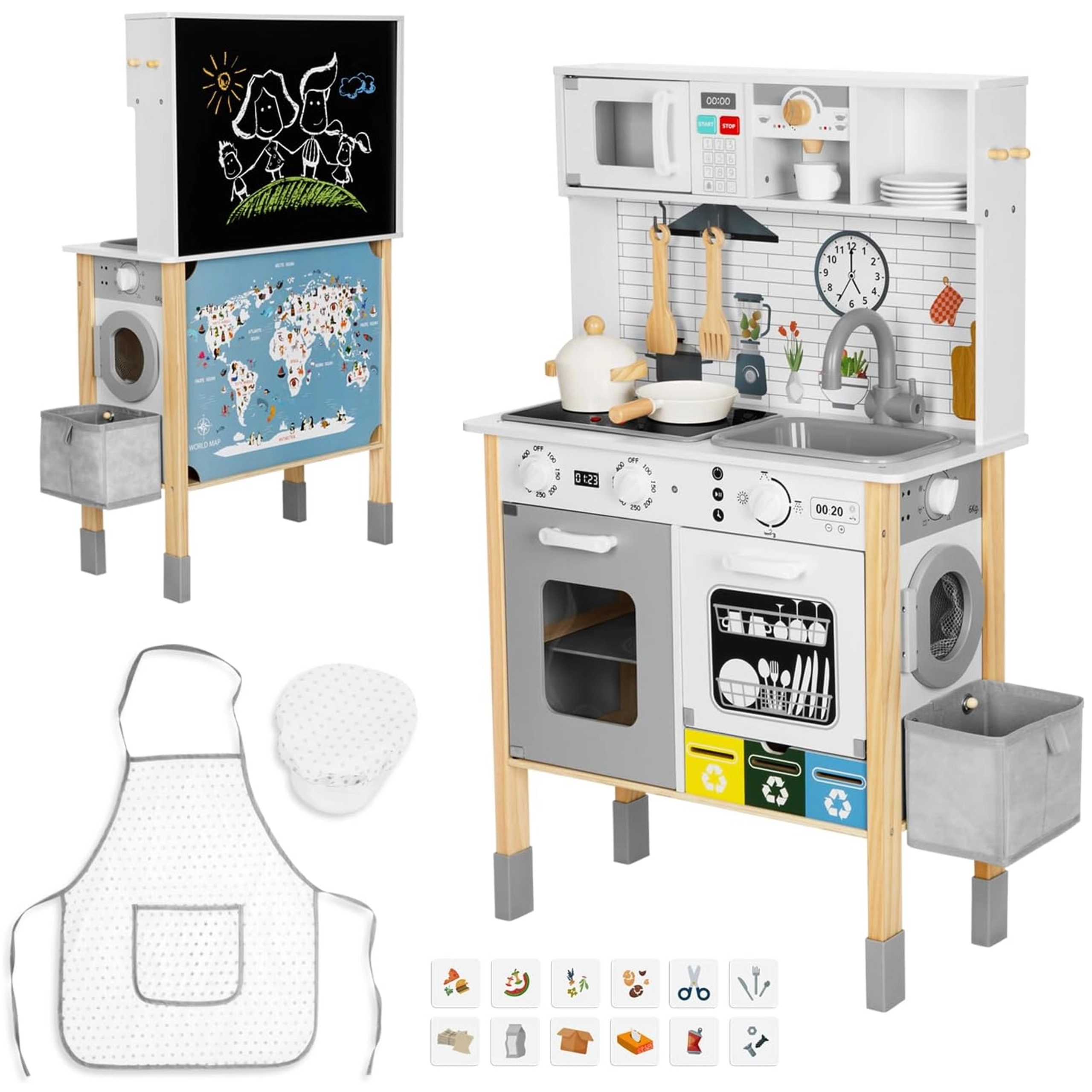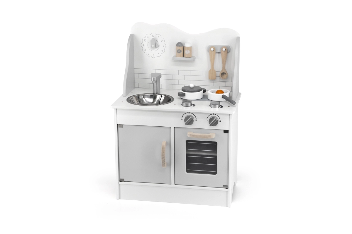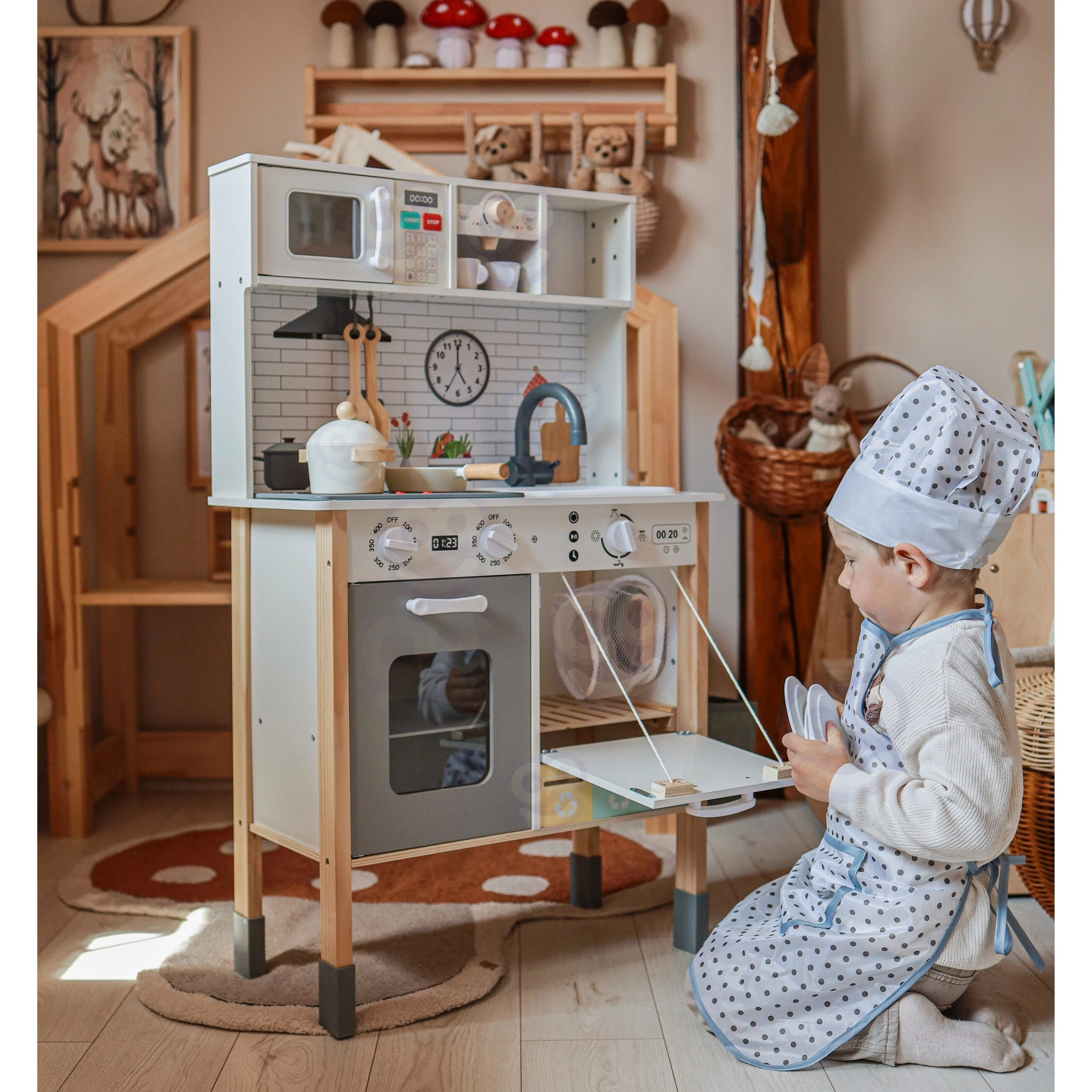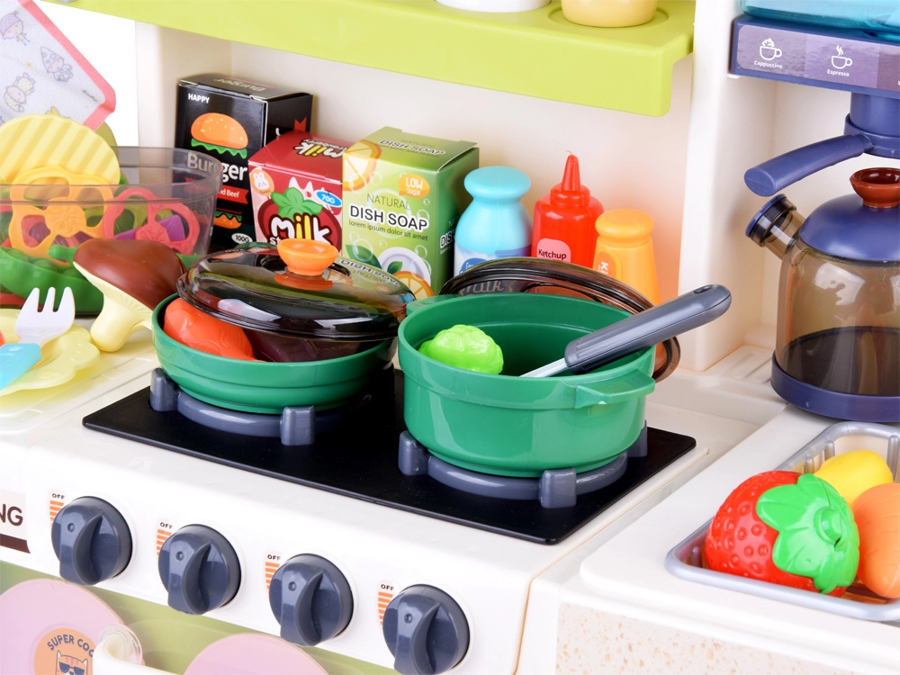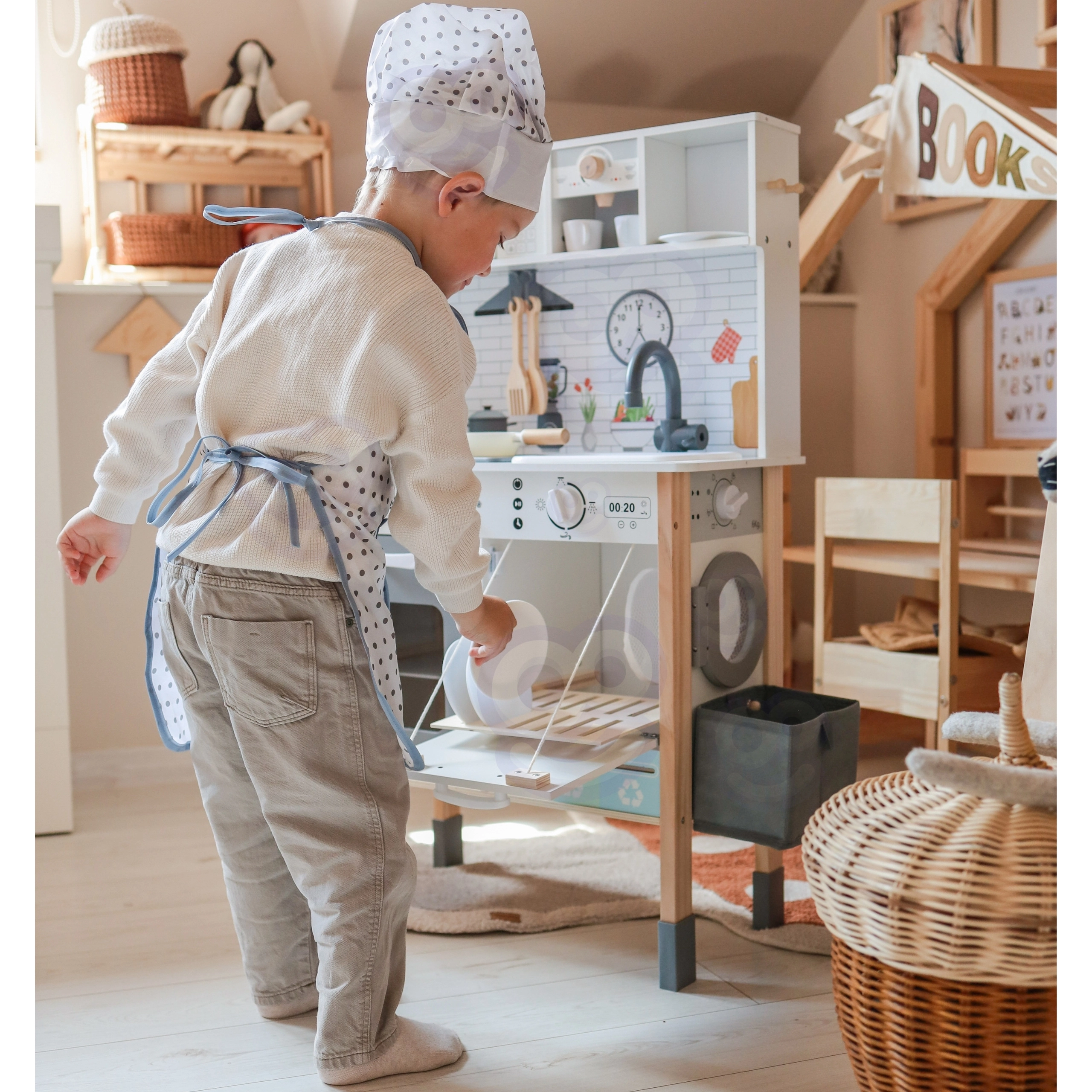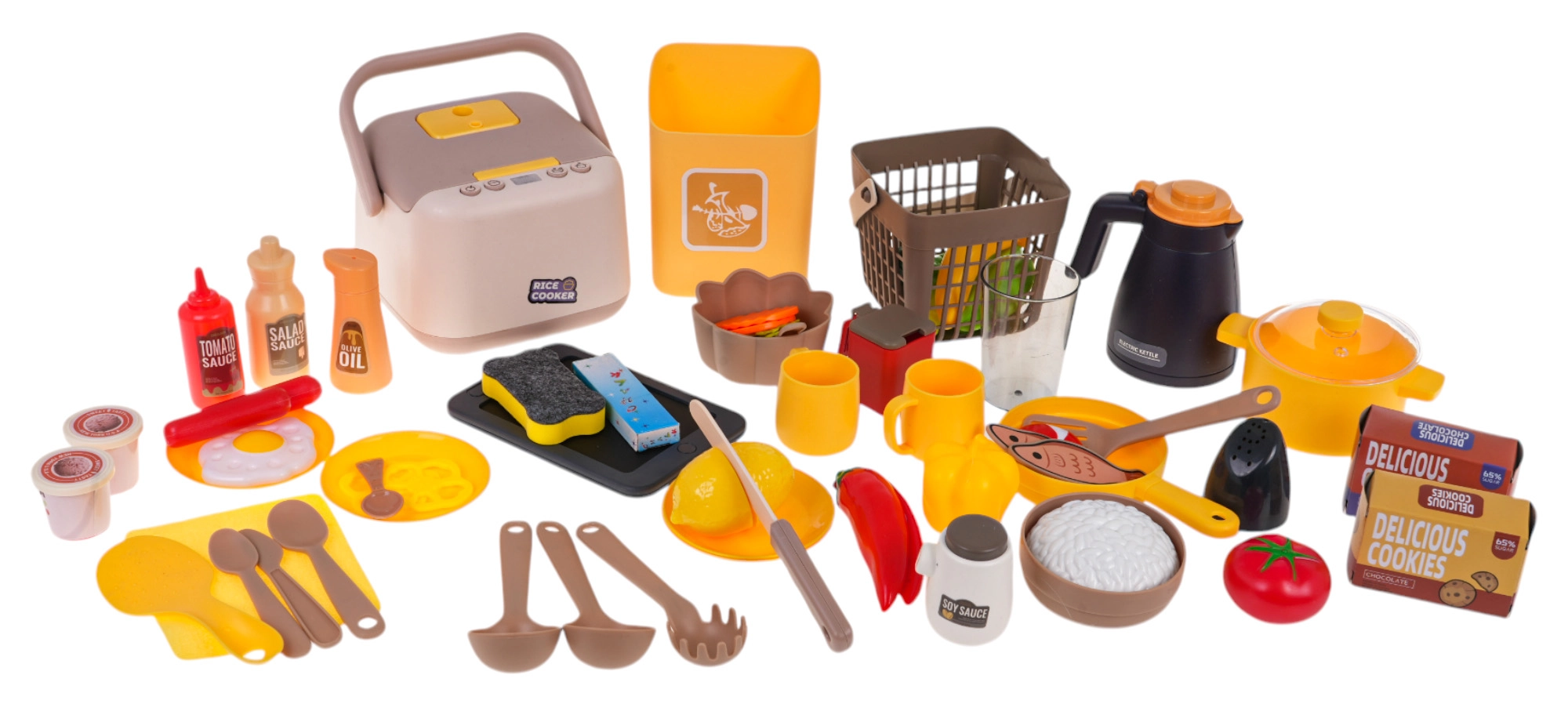 In het assortiment vind je kinderkostuums en speelsets: een kinderkeuken en uitrusting voor kleine koks, een doktersset voor kinderen met stethoscoop, verbanden en speel-medicijnen, een kinderkassa en winkelmandje, en ook kindergereedschap, een werkbank en beschermingsmiddelen voor in de werkplaats. De rekwisieten zijn gemaakt van veilige materialen (hout en kunststof), gecertificeerd en onschadelijk, gedetailleerd afgewerkt, prettig in de hand en stevig genoeg voor dagelijks spel; ze ontwikkelen fijne motoriek, communicatie, samenwerking en logisch denken.