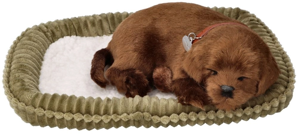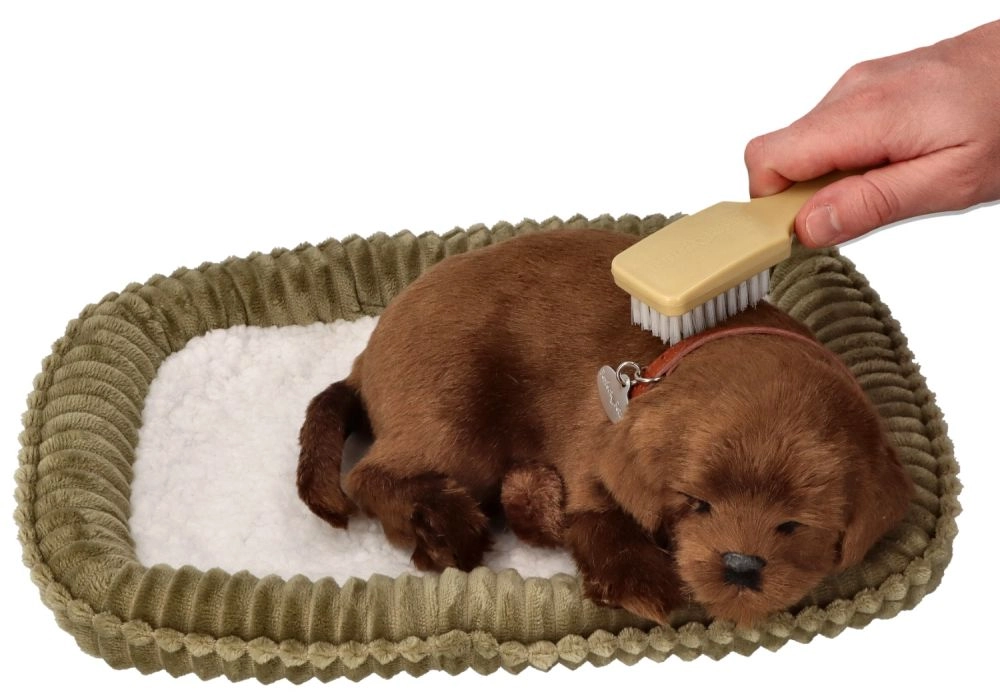 Pluchen snurkend puppy – chocoladekleurige labrador op een mandje