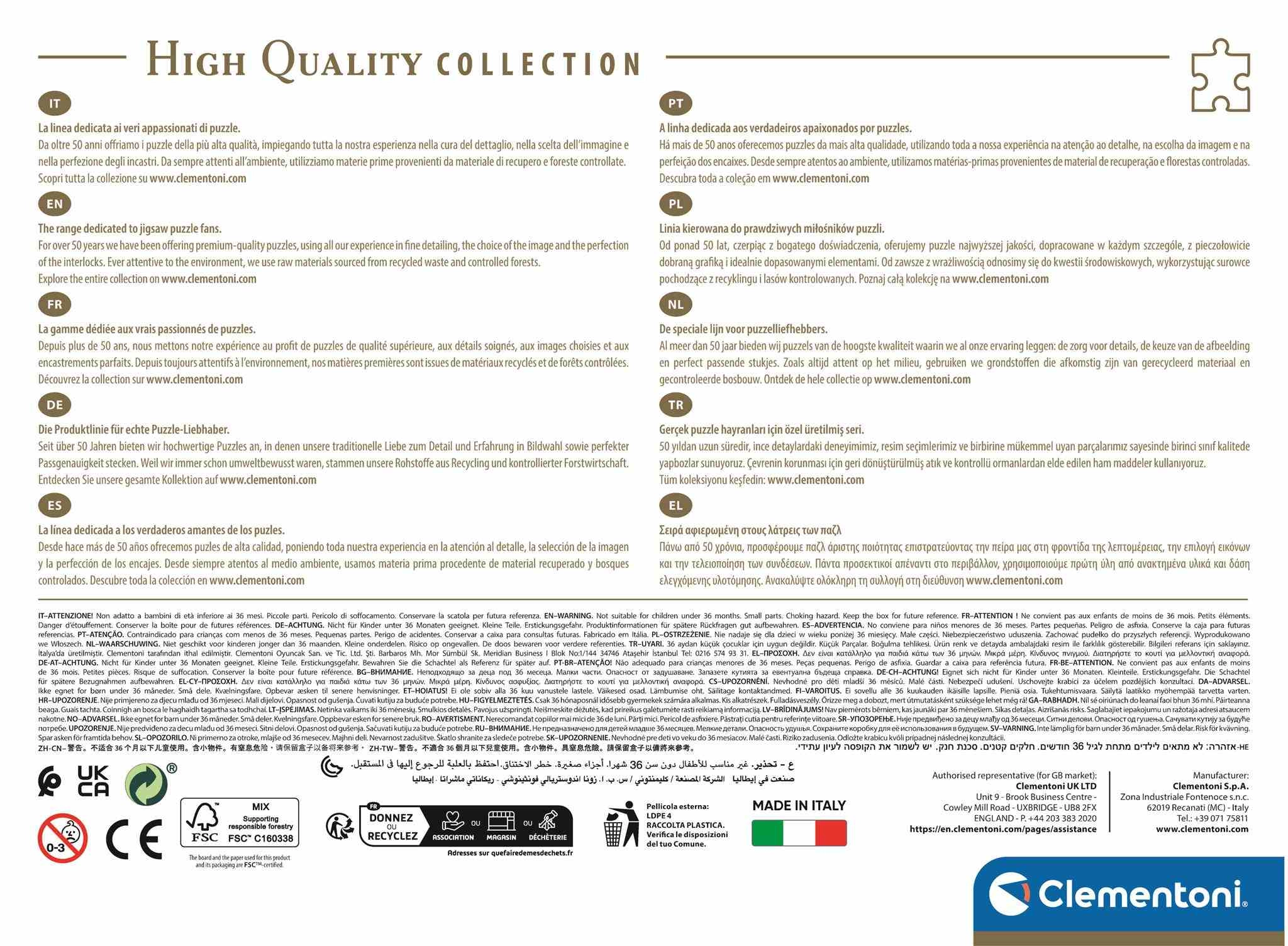 Kwalitatieve puzzels voor volwassenen herken je meteen: precisiegesneden zonder rafels, stevige en duurzame stukjes van hard karton, een matte antireflectie-afwerking tegen schittering en rijke, natuurgetrouwe kleuren. Dankzij het nauwkeurige kliksysteem sluit alles perfect aan, is het leggen soepel en past elk stukje precies.