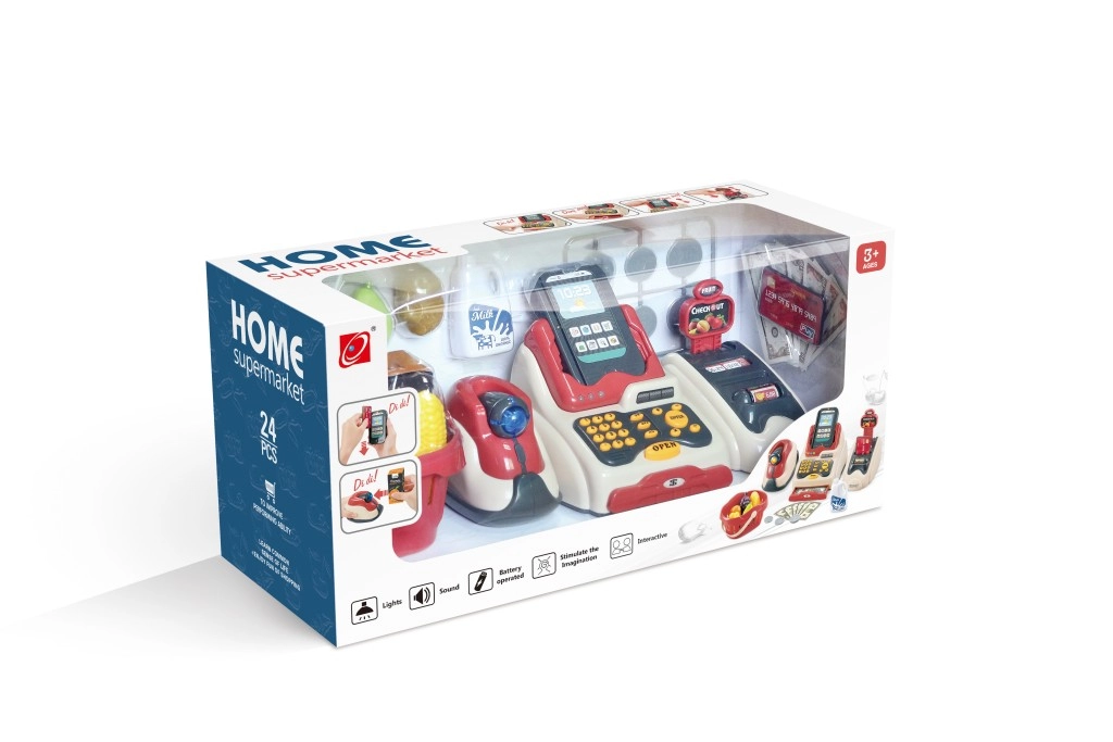 Speelset voor kinderen: kassa, mandje en etenswaren met effecten