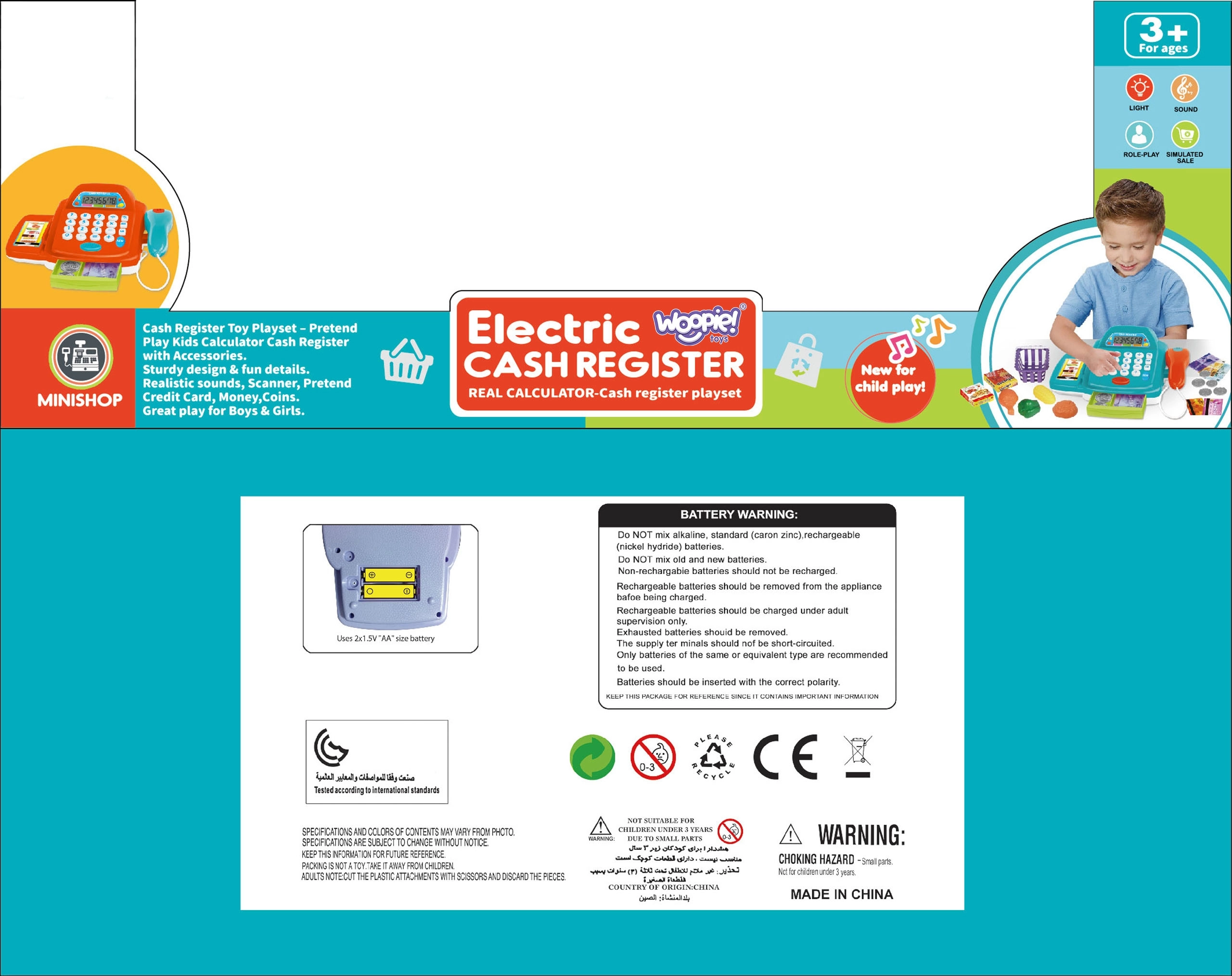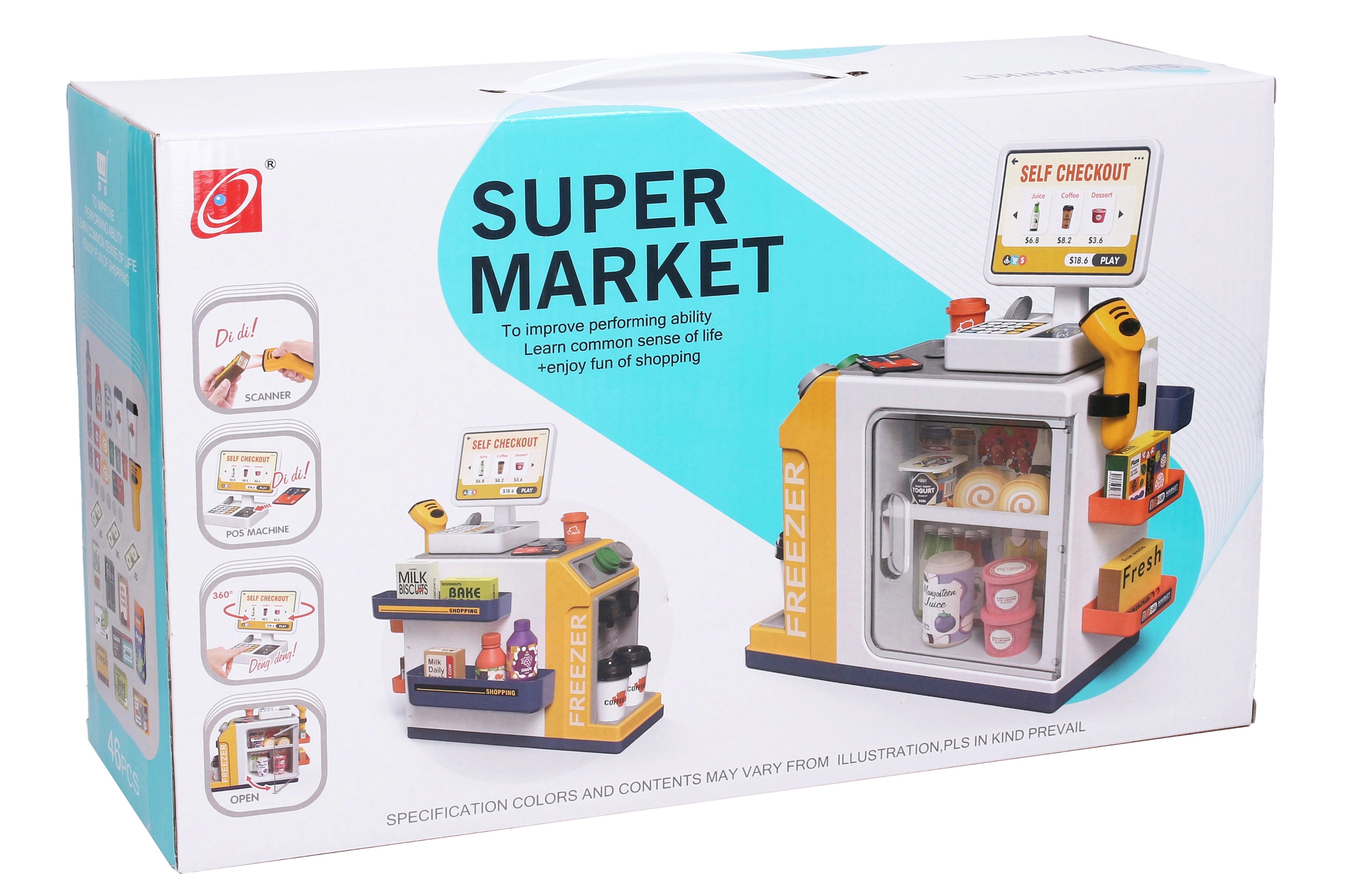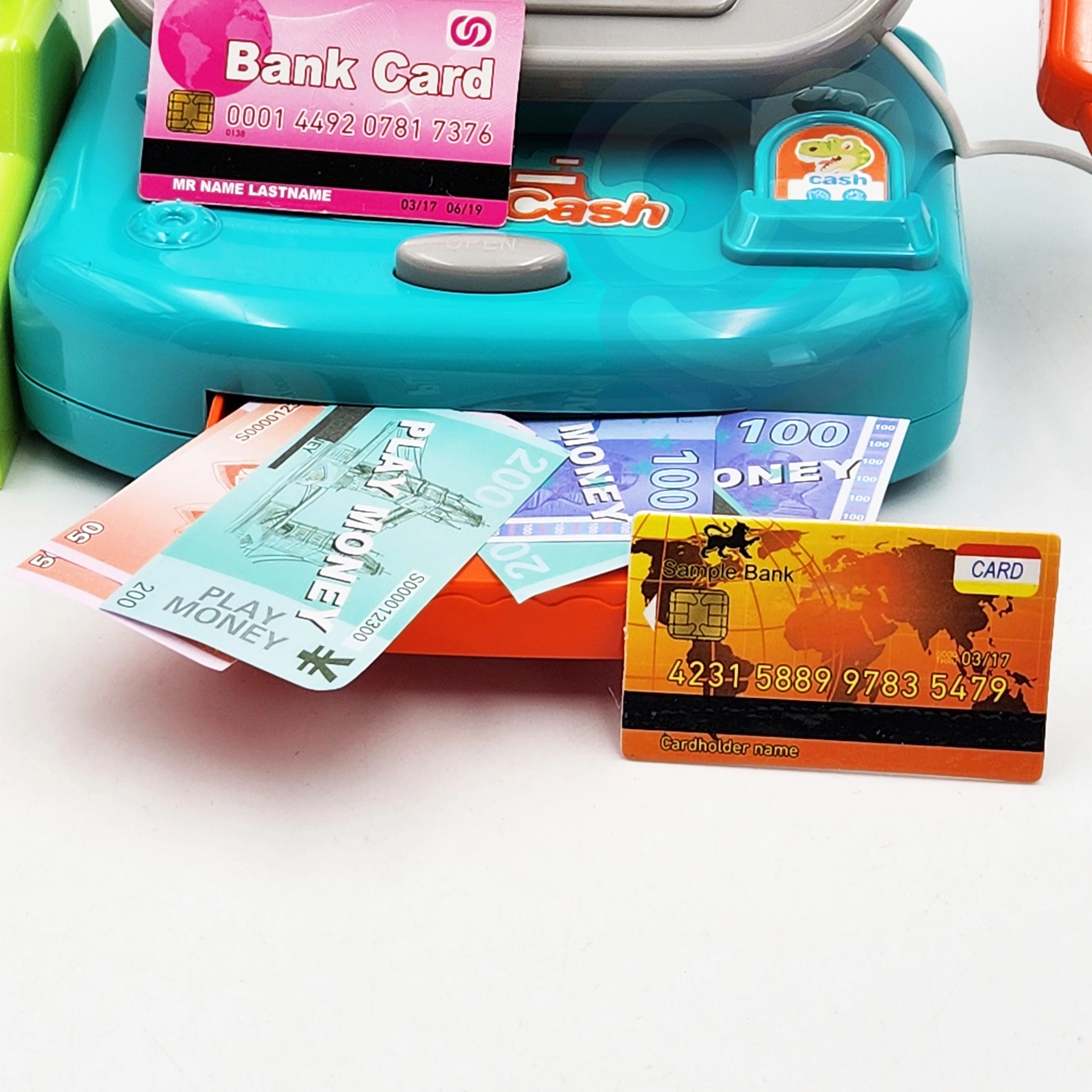 Kinderkassa’s bieden een barcodescanner en handscanner, pinautomaat, bankbiljetten en munten, rekenmachine, microfoon en licht- en geluidseffecten – ideaal voor spelenderwijs leren en het oefenen van het bedienen van de kassa. Daarmee leren kinderen rekenen, verbeteren ze de communicatie met de klant en ontwikkelen ze hun financiële geletterdheid. Etenswaren voor de kinderwinkel (fruit, groenten, brood, doosjes of blikjes) van hout, plastic en textiel, vaak met klittenband of magneet, stimuleren de fantasie en de fijne motoriek.