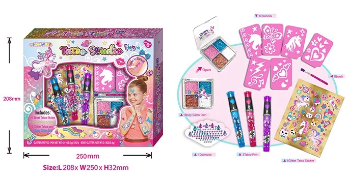 Je vindt hier tattoostiften voor het lichaam, kleurrijke sjablonen, stempels, glittertatoeages, tattootransfers en stickers – allemaal met focus op niet-toxische samenstelling, afwasbaarheid en eenvoudige toepassing. Tijdelijke lichaamsverf en tatoeagesets voor kinderen zijn eenvoudig met water en zeep te verwijderen, zodat experimenteren met designs, teksten en motieven altijd zorgeloos is. Spelen als tattoo-artiestje ontwikkelt de fijne motoriek, handprecisie, kleurgevoel en sociale vaardigheden bij het ontvangen en verzorgen van een ‘klant’. Kinderen oefenen het plannen van een motief, werken met sjablonen en veilige werkwijzen in de studio, en leren geduld en samenwerken. Tatoeage-accessoires en kostuums vullen de thuissalon prachtig aan en stimuleren zelfexpressie, fantasie en creatieplezier.