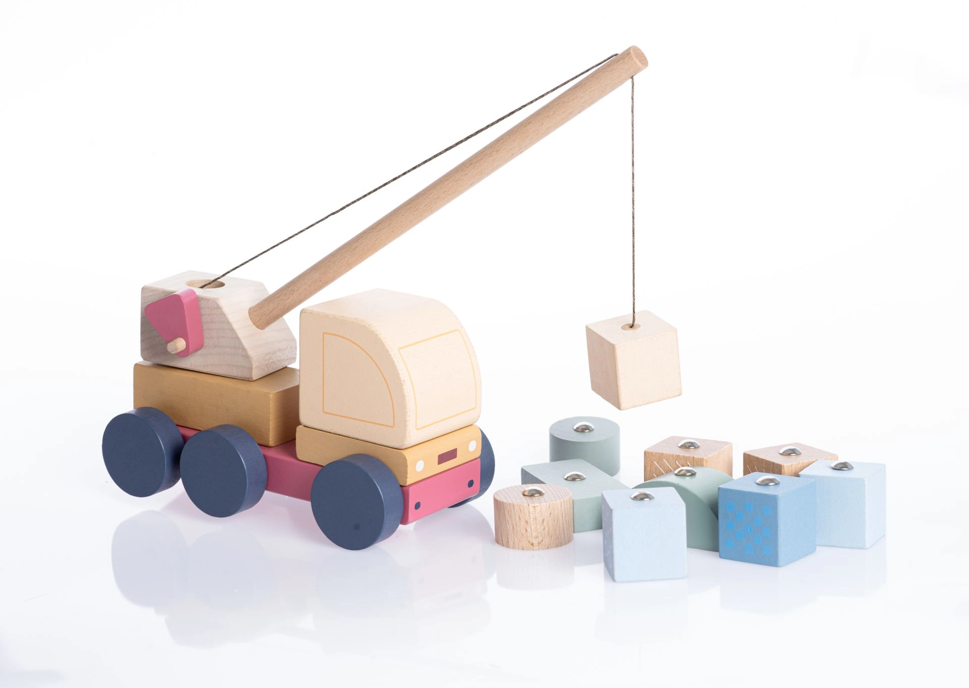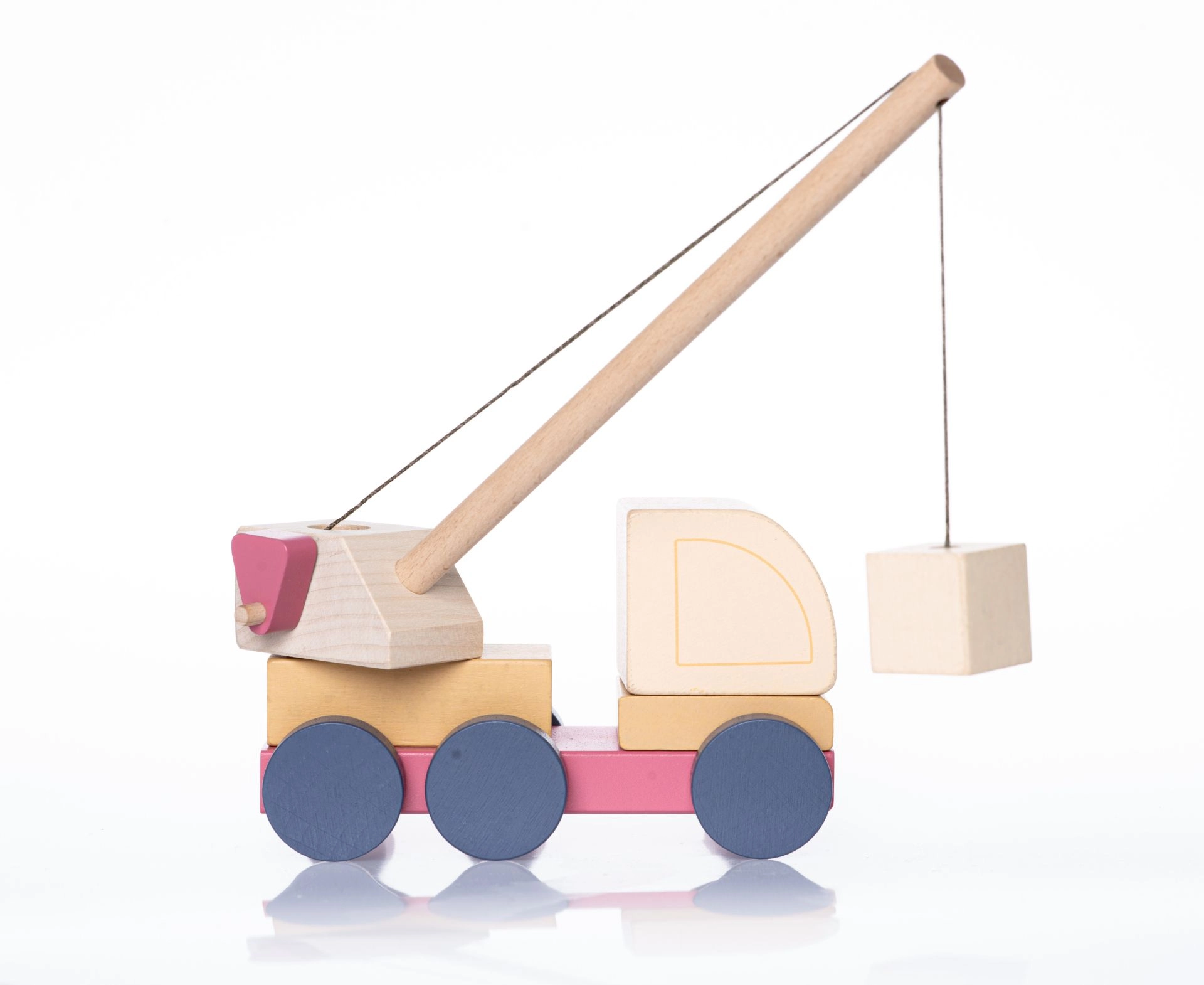 Cubika pastelgekleurde autokraan met magneet – houten puzzel 14 delen
