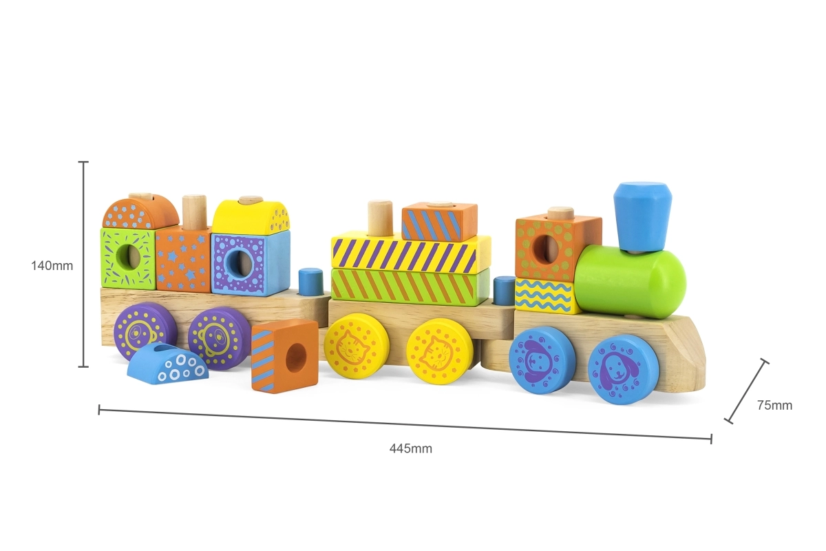 Cubika pastel regenboogtrein met twee wagons – houten stapelspel 15 stukken