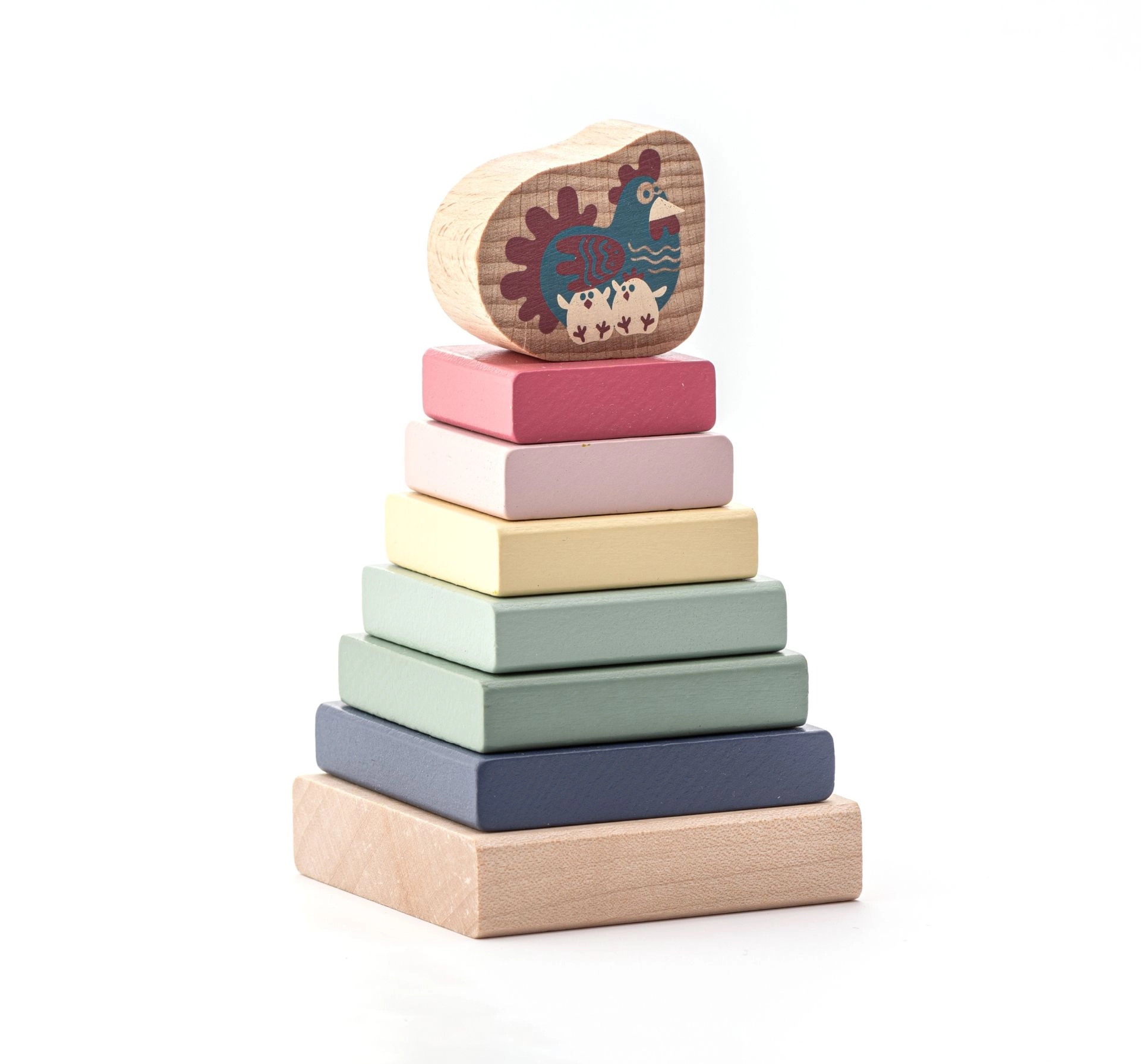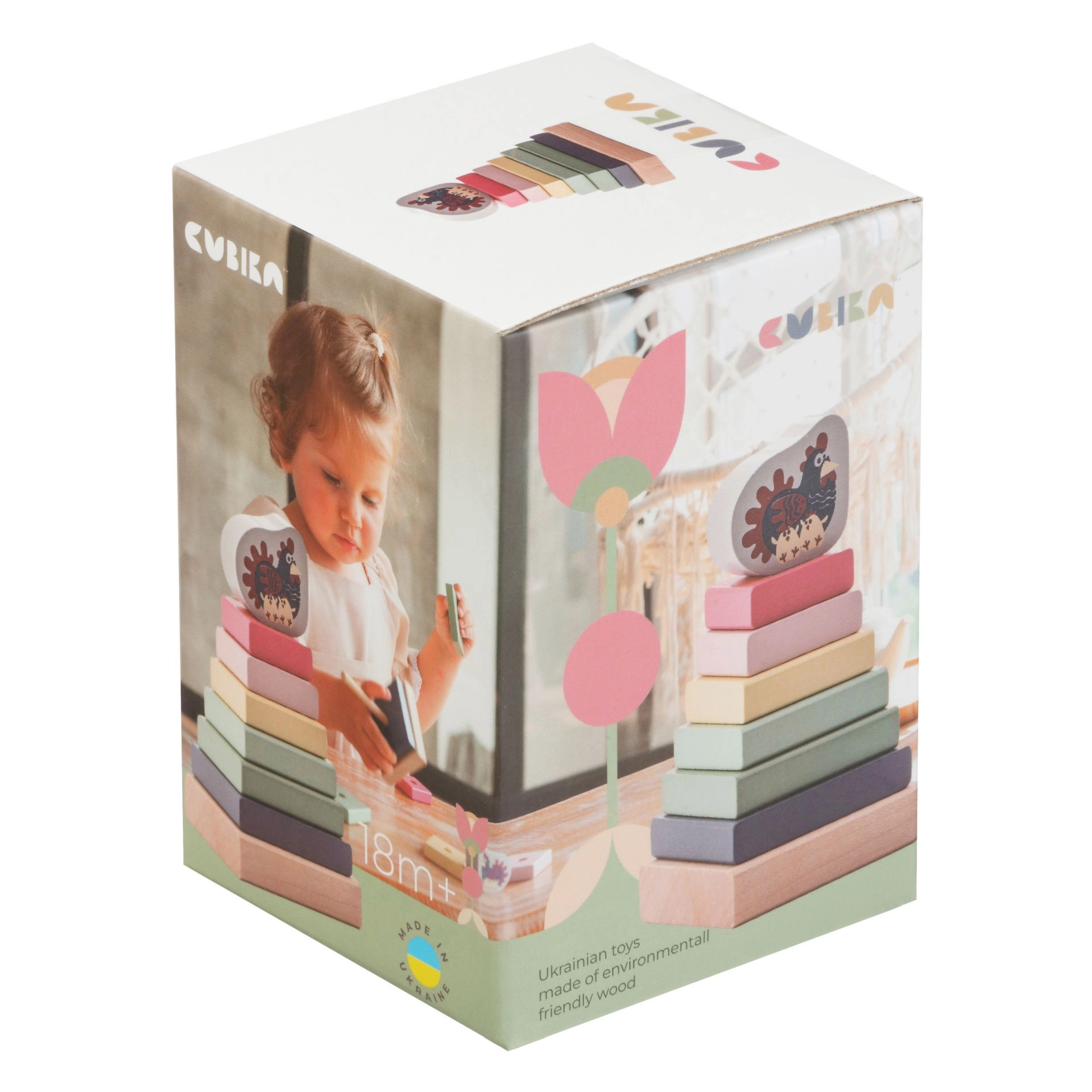 Cubika pastelgekleurde houten piramide met kip – puzzel met 8 delen
