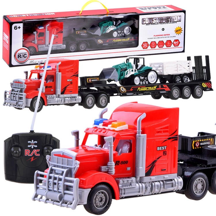 RC vrachtwagen met dieplader en tractor met aanhanger – Rood
