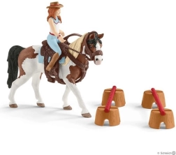 De western rijset Hannah brengt de sfeer van barrel racing-wedstrijden naar de kinderkamer. De set biedt kleurrijke tonnen en lage obstakels die vrij te plaatsen zijn, zodat het kind gemakkelijk een eigen rijbaan maakt. Dankzij het afneembare zadel en hoofdstel kan Hannah het paard klaarmaken voor training en wedstrijd.