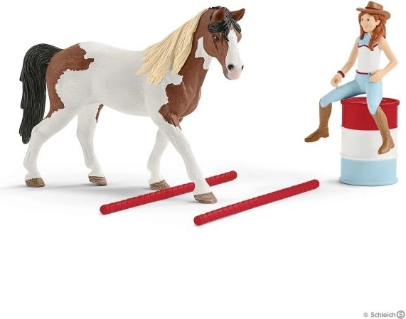 - Hannah-figuur met beweegbare armen, paard (merrie), afneembaar zadel en hoofdstel, tonnen, obstakels en accessoires