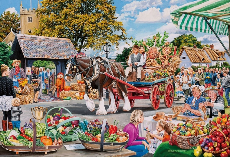 De set bevat 4 puzzels met hetzelfde aantal stukjes en afmeting (Meiviering, Kampvuur, Oogstfeest, Kerstmis). In de verpakking zijn voorbeelden van de te leggen motieven inbegrepen.