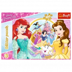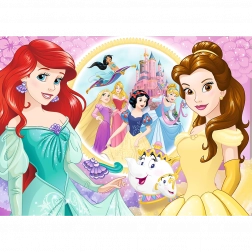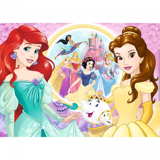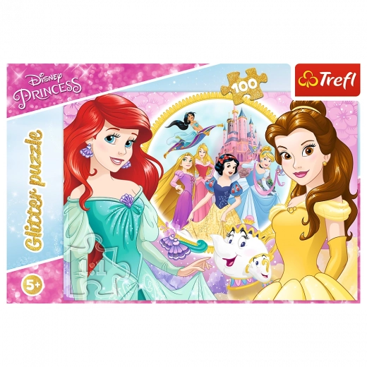 Magische kinderpuzzel met motief van Disney-prinsessen Belle en Ariel zal alle kleine fans blij maken. De puzzel heeft 100 stukjes en is versierd met fijne gouden glitters, die zowel de afbeelding als de doos een unieke glans geven. Na het leggen ontstaat een afbeelding van 410 × 278 mm.