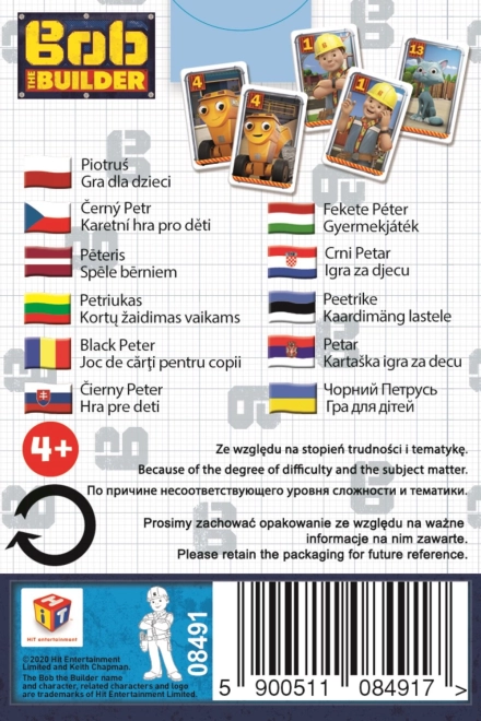 Het kinderspel Zwarte Piet met afbeeldingen van de geliefde Bob de Bouwer is ideale entertainment voor elke kleine bouwer. Het spel bevat 25 kaarten die door de spelers onder elkaar worden verdeeld. Het doel is om kaartparen te vormen en alle kaarten uit je hand weg te spelen. De winnaar is de speler die geen Zwarte Piet heeft.