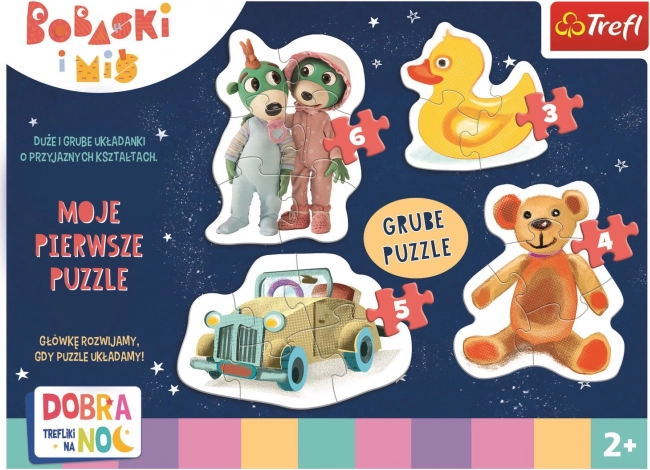 De schattige babypuzzelset “Welterusten” brengt de geliefde TREFLIKI-figuurtjes en hun speelgoed in de vorm van vier losse afbeeldingen. Elke puzzel heeft een verschillend aantal stukjes (3, 4, 5 en 6), zodat een kind stap voor stap beter wordt en meer zelfvertrouwen krijgt tijdens het puzzelen.