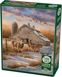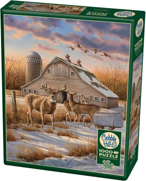 Ontdek de charme van een winterlandschap met herten, een schuur en vliegende ganzen – de gedetailleerde illustratie vormt een indrukwekkend motief dat zowel natuurliefhebbers als liefhebbers van het platteland zal aanspreken. COBBLE HILL-puzzels staan bekend om hun precieze kwaliteit en unieke stans, die een bijzondere puzzelervaring biedt.