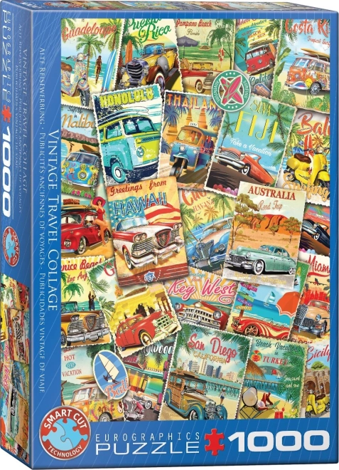 Geniet van slimme entertainment met de EUROGRAPHICS-puzzel met een retro reiscollage van 1000 stukjes. Dankzij de unieke stans hebben de stukjes ongewone vormen, wat de moeilijkheid en het plezier verhoogt. Na het leggen ontstaat een afbeelding van ca. 48 × 68 cm – ideaal om in te lijsten.
