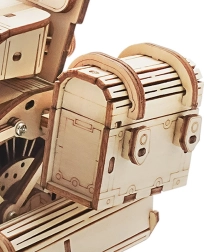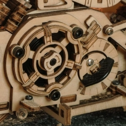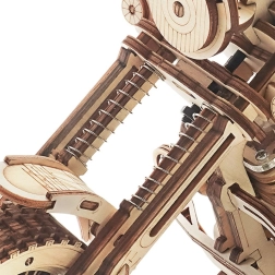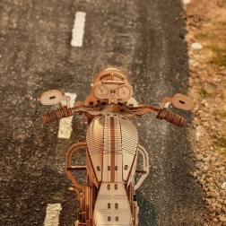 Deze houten mechanische motor is een uitstekende keuze voor iedereen die houdt van design, techniek en ambachtelijk handwerk. De opwindbare veeraandrijving met trekker laat het model vlot rijden, terwijl het functionele stuur gedeeltelijke controle over de richting mogelijk maakt. De realistische motorloop wordt prachtig aangevuld door de beweging van de zuigers en de werkende vering van de voorvork.