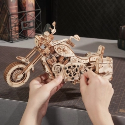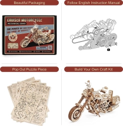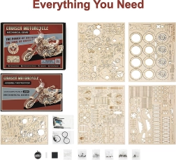 Ontdek het plezier van modelbouw met deze precieze 3D-bouwset van een motorfiets van multiplex. Het model biedt een opwindbare veeraandrijving, functionele besturing, bewegende zuigers en werkende voorvering. Met 420 onderdelen en een gemiddelde moeilijkheidsgraad geniet je 4–5 uur van bouwplezier; na montage kan de motor zelfstandig rijden en valt hij op door zijn decoratieve uitstraling en kleine opbergvakjes bij het zadel.