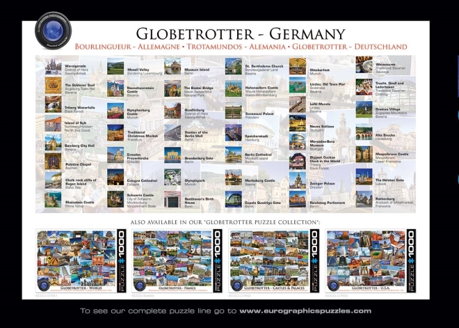 Ontdek de schoonheid van Duitsland met deze hoogwaardige EUROGRAPHICS-puzzel van 1000 stukjes. Dankzij de unieke stans met onregelmatige vormen is het leggen zowel een uitdaging als een plezier. Het formaat na het leggen is ca. 68 × 48 cm. Originele puzzelvormen, hogere moeilijkheidsgraad en een gedetailleerde kaart van Duitsland zullen elke liefhebber van puzzels en reizen bekoren.