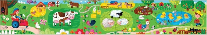 De puzzel bevat vier afzonderlijke afbeeldingen met 1-4 stukjes, wat samen een totaal van 10 stukjes maakt, die kinderen naar hun eigen fantasie kunnen samenstellen. Bovendien bevat het 16 omringende stukjes, die samen een totaalbeeld vormen van bijna 1 meter lang. Op deze manier vermaken kinderen zich niet alleen, maar leren ze ook eenvoudige rekenvaardigheid, omdat het aantal stukjes overeenkomt met het aantal figuren en dieren op de puzzel.