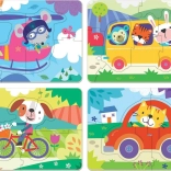 Deze set bevat vier losse puzzels van 24 x 16 cm met een verschillend aantal stukjes (van 5 tot 8), die stap voor stap de puzzelvaardigheden van het kind verbeteren en de moeilijkheidsgraad verhogen. Elke puzzel maakt het mogelijk een compleet vervoersmiddel afzonderlijk uit te nemen en samen te stellen, wat de ontwikkeling van motoriek en logisch denken bij kinderen ondersteunt.