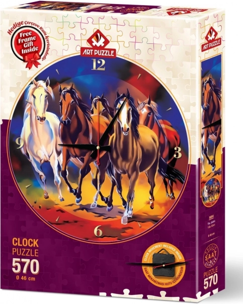 Originele combinatie van plezier en functionaliteit: leg een ronde puzzel met een motief van een galopperende paardenkudde en verander deze in een volledig functionele wandklok. De verpakking bevat alles wat u nodig hebt, inclusief een uurwerkmechanisme en een frame. Dankzij de diameter van ca. 46 cm krijgt u een in het oog springende decoratie voor elk interieur.