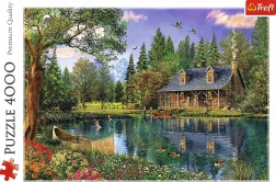 Geniet van de serene sfeer van de natuur met deze grootformaatpuzzel die een houten hut aan een rustig meer toont, omgeven door bomen en wilde natuur. Na het leggen ontstaat een gedetailleerd beeld van 136 × 96 cm – ideaal om in te lijsten en je interieur te verfraaien.