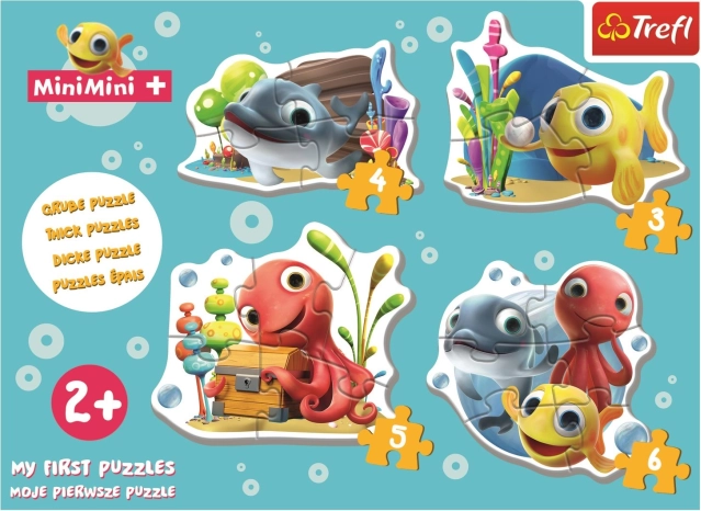 Kinderpuzzel Rybka MiniMini: 4 puzzels met 3–6 stukjes, stevig karton, vrolijke kleuren. Ideaal voor kinderen vanaf 2 jaar. Populaire personages van het kanaal MiniMini.