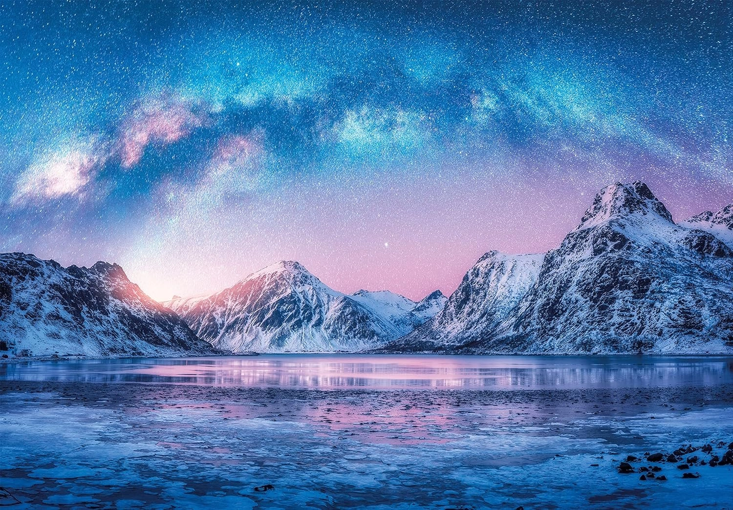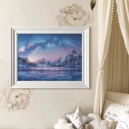 Een landschap met bergen, een meer en een sterrenhemel ondersteunt focus en innerlijke rust tijdens het puzzelen.
