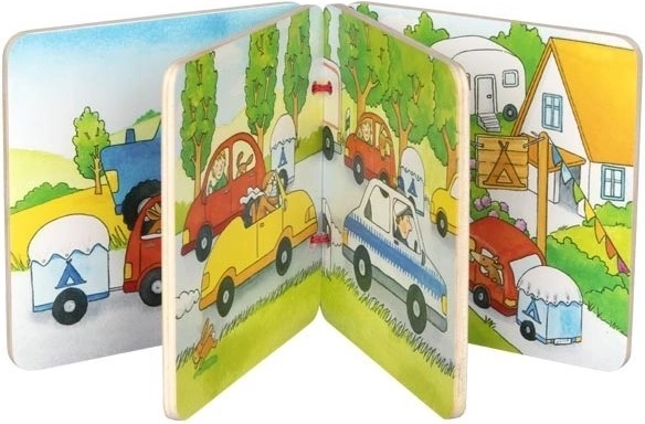 Het houten boek “We gaan op vakantie” van het merk GOKI nodigt kinderen uit om de wereld te ontdekken tijdens een gezinsuitje. Op de stevige houten pagina’s staan 8 geïllustreerde afbeeldingen die een verhaal vertellen vanuit het perspectief van een kleine rode auto. Kinderen kunnen het verhaal vergelijken met wat ze om zich heen zien, vragen stellen en spelenderwijs hun woordenschat ontwikkelen.