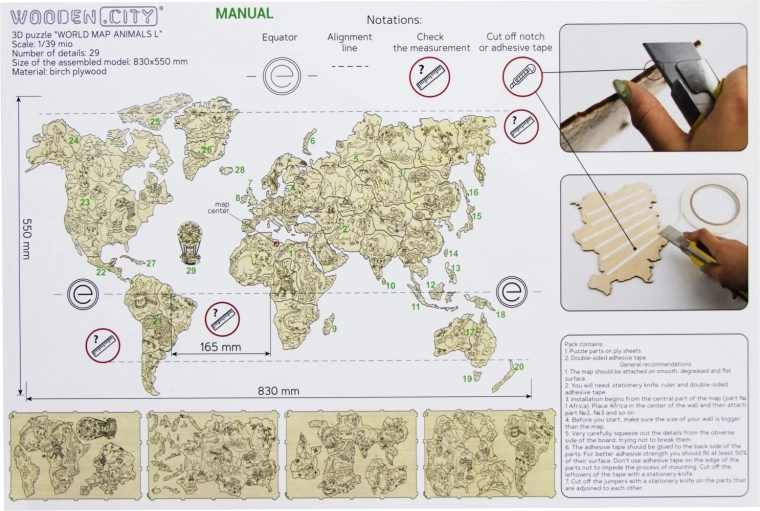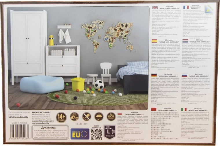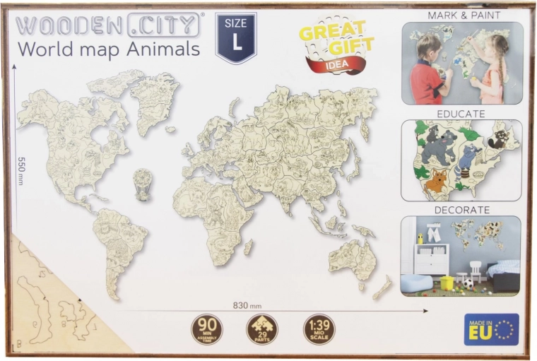 Eenvoudige montage - eenvoudig te assembleren en aan de muur te bevestigen met behulp van dubbelzijdige tape. De afmetingen van de kaart zijn 830 mm x 550 mm. Het perfecte cadeau dat elke ontvanger blij maakt, zonder plastic verpakkingen van het merk WOODEN CITY.