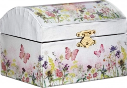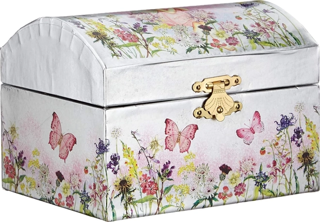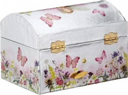 Elegant muzieksieradendoosje van GOKI in het design ‘Bloeiende Weide’ maakt alle liefhebbers van sieraden en kleine schatten blij. Na het openen begint de ballerina voor het spiegeltje te dansen en klinkt de zachte melodie Het Zwanenmeer. Zilveren glans, bloemen- en vlindermotieven en een veilige sluiting maken er zowel een mooi decorstuk als een praktische opberger van.