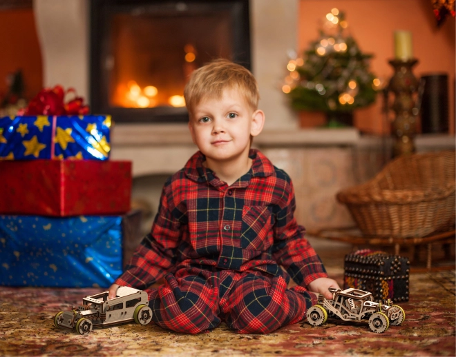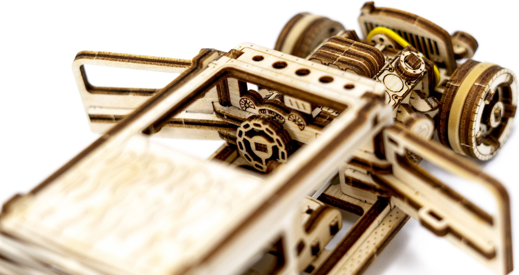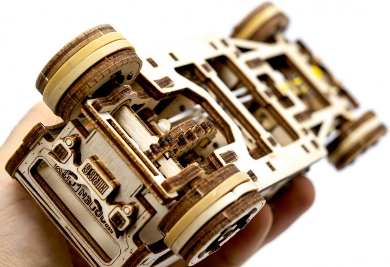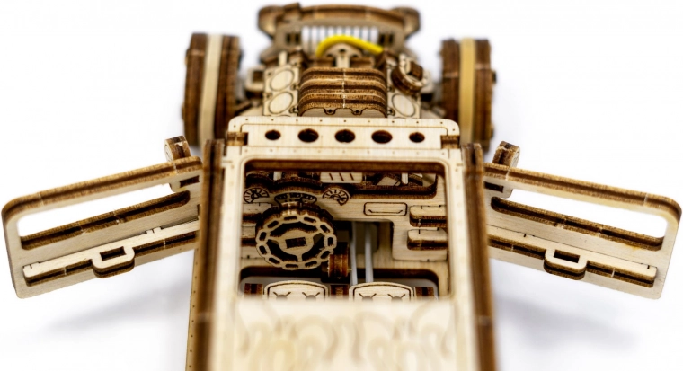 Kijk je via het dak naar binnen, dan zie je een gedetailleerde motor, een dubbele zitplaats en een versnellingspook. Dankzij de doordachte mechanica beleef je plezier niet alleen tijdens het bouwen, maar ook bij het spelen en tentoonstellen. Het model is gemaakt van ecologische berkenmultiplex en in de verpakking zit een geïllustreerde handleiding. Moeilijkheid 3/5, geschatte bouwtijd ca. 2 uur.