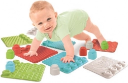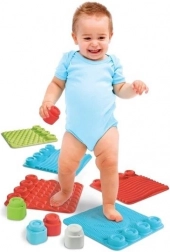 Vier gekleurde matten met verschillende reliëfs moedigen kinderen aan om te ontdekken met aanraking, te kruipen en de eerste balansstappen te nemen.