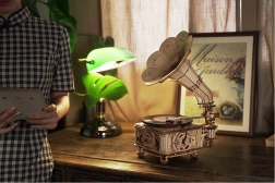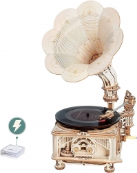De verpakking bevat materiaal voor het assembleren van het model en een vinylplaat met drie melodieën voor een volledige ervaring.