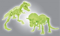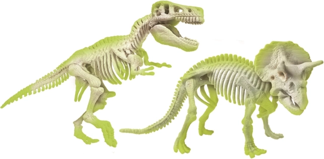 Fluorescerende skeletdelen absorberen daglicht en gloeien in het donker. De voltooide T‑Rex- en Triceratops-modellen zijn een opvallende decoratie én een educatief hulpmiddel.