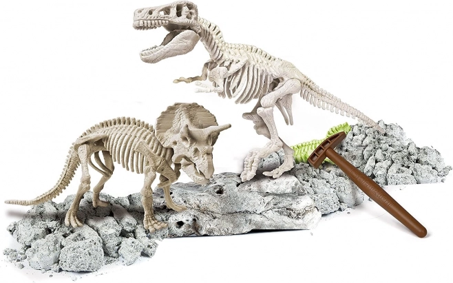 Deze educatieve set uit de Science & Play‑serie biedt een authentieke ervaring van paleontologisch onderzoek. In het “gesteente”‑blok vind je onderdelen van twee gedetailleerde skeletten, die je met het hamertje en beiteltje voorzichtig vrijmaakt en vervolgens samenstelt tot indrukwekkende modellen. Speciaal fluorescerend materiaal absorbeert daglicht en licht daarna op in het donker, wat het wow‑effect vergroot en motiveert tot verder ontdekken.
