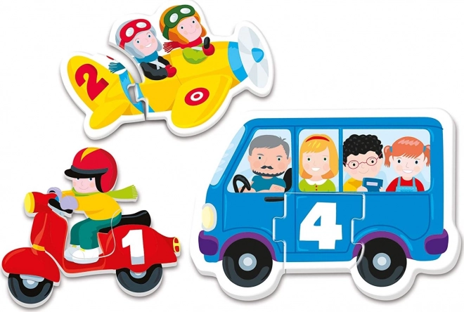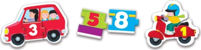 Deze kleurrijke puzzelset is ideaal voor het eerste leren van cijfers. Kinderen tellen eerst de passagiers in leuke vervoermiddelen en koppelen vervolgens het juiste cijferstukje. Intuïtief contour-matchen helpt kinderen snel de relatie tussen hoeveelheid en cijfer te begrijpen.