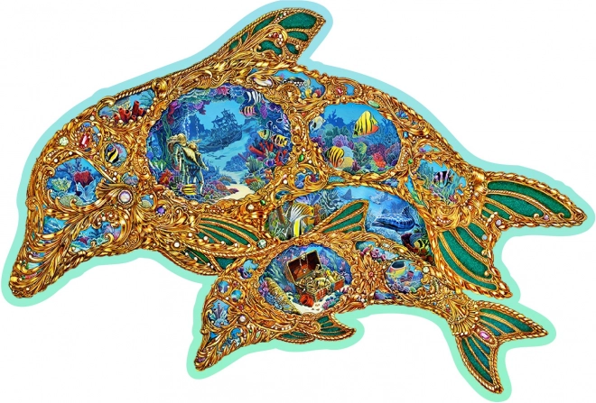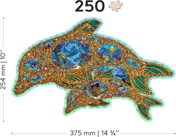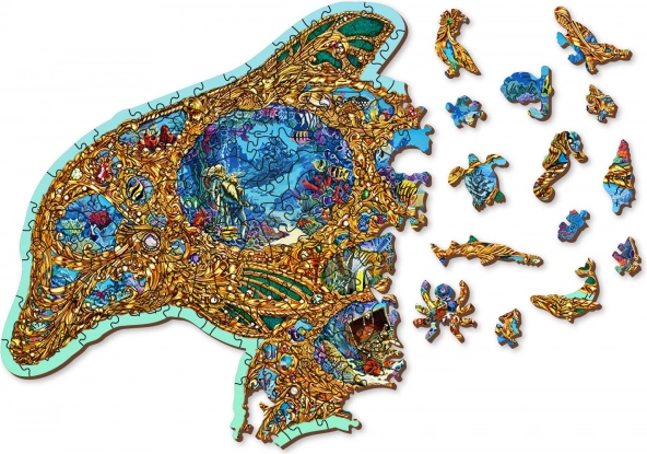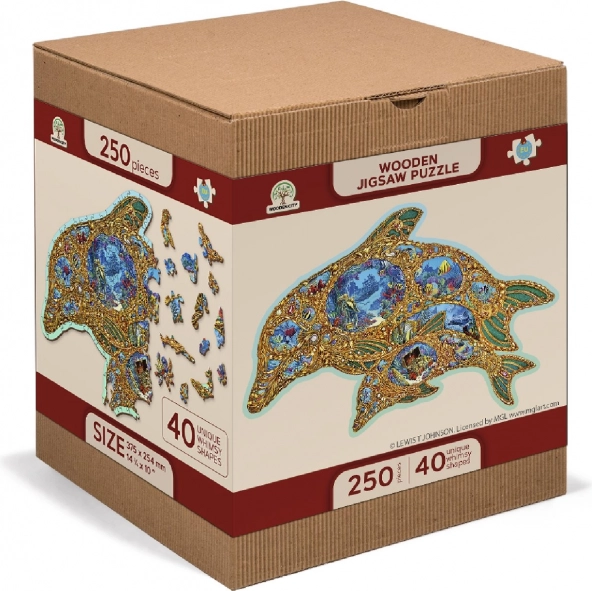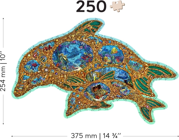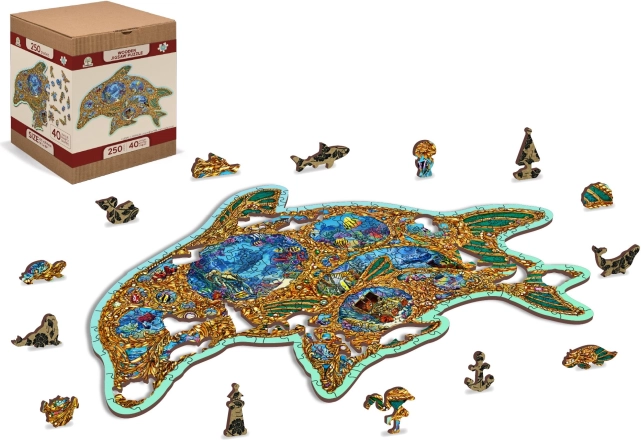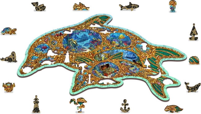 Trakteer jezelf op originele fun met een houten puzzel in de vorm van een dolfijn, geïnspireerd op de onderwaterwereld. Dankzij speciaal gevormde stukjes – waarvan een deel de vorm heeft van zeedieren – is het leggen visueel aantrekkelijk en tegelijk uitdagender dan bij klassieke puzzels. Door laser geaccentueerde details geven het motief diepte en sommige stukjes kunnen als kleine figuurtjes worden neergezet.
