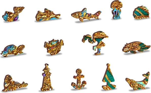 Kleurrijk onderwaterdesign met speciale stukjes in de vorm van zeedieren en planten geeft het puzzelen originaliteit en plezier in het ontdekken.