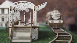 - Houten 3D-puzzel – mechanisch model van een treinstation