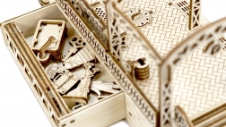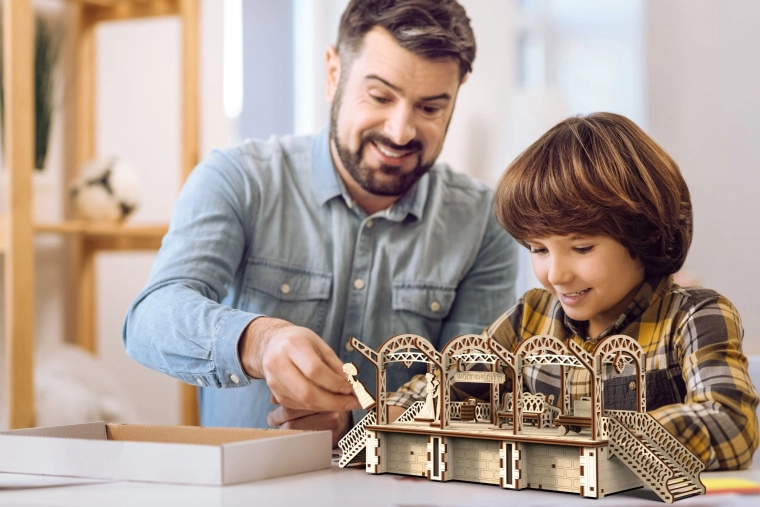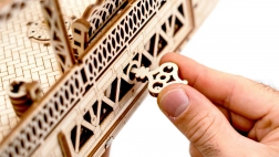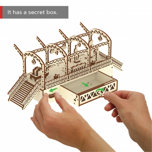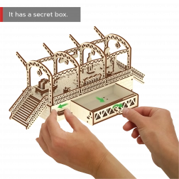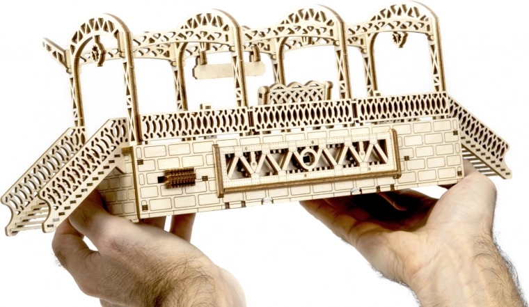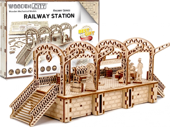 De houten 3D-puzzel WOODEN CITY Treinstation brengt de authentieke sfeer van een station met decoratieve bogen, bankjes en reizigersfiguurtjes. Montage gebeurt zonder lijm of gereedschap; de onderdelen passen precies en het eindmodel is niet alleen decoratief, maar ook functioneel – kleine spullen berg je eenvoudig op in het geheime vakje.