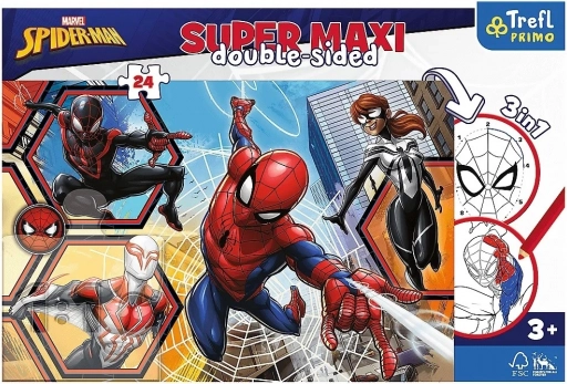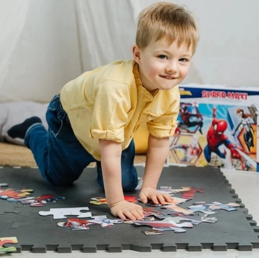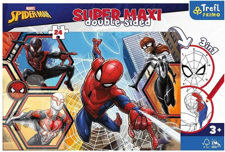 De dubbelzijdige Super Maxi-puzzel in de wereld van SPIDER-MAN biedt kinderen drie activiteiten in één: het leggen van een grootformaat afbeelding, inkleuren en eenvoudig spelplezier. Dankzij de 24 grote stukjes is het leggen intuïtief en toegankelijk, ook voor jongere kinderen, terwijl het voltooide beeld een formaat heeft van ca. 60 × 40 cm.