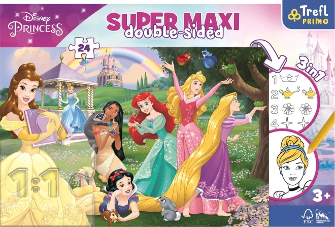 De dubbelzijdige Super Maxi-puzzel biedt kinderen dubbele dosis plezier. De ene kant toont een kleurrijke afbeelding met DISNEY PRINCESS en 24 grote stukjes die kleine handjes gemakkelijk kunnen leggen. De andere kant dient als kleurplaat en eenvoudige telactiviteit die logisch denken en oog-handcoördinatie stimuleert.