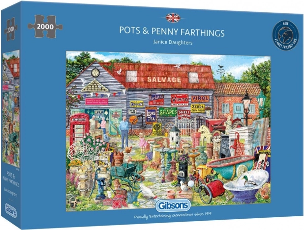 Ontdek de charme van nostalgie met de grote puzzel van Gibsons – Potten en snuisterijen voor een prikje met 2000 stukjes. Je vindt er een gedetailleerd geïllustreerde scène van een erf vol schatten, perfect voor liefhebbers van antiquiteiten en veeleisende puzzelaars. Inclusief voorbeeldposter en na het leggen ontstaat er een hoogwaardige, grootschalige afbeelding van 98 × 68 cm.