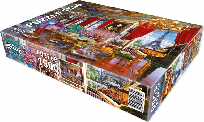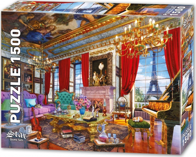 Een luxueus gedecoreerd interieur met uitzicht op de Eiffeltoren biedt een unieke sfeer en een visueel rijke scène die zowel tijdens het puzzelen boeit als na inlijsten schittert.