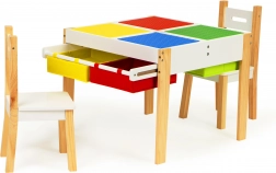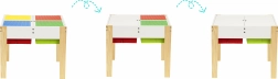 Het tweekleurige, draaibare en uitneembare blad bestaat uit twee delen: één zijde is compatibel met bouwblokjes en stimuleert creatief bouwen, de andere is glad voor tekenen, schrijven en knutselen. In het midden vind je 4 ruime bakken waarin kinderen bouwstenen, potloden, papier en boekjes kunnen opbergen – opruimen is zo in een handomdraai gedaan.