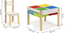 Creëer een eigen creatief hoekje voor kinderen met de ECOTOYS-set, die speeltafel en opbergruimte in één combineert. De robuuste poten van dennenhout en het duurzame MDF-blad zorgen voor stabiliteit en een lange levensduur. Dankzij het strakke Scandinavische design past de set perfect in de kinderkamer, speelkamer of wachtruimte.