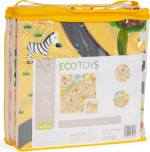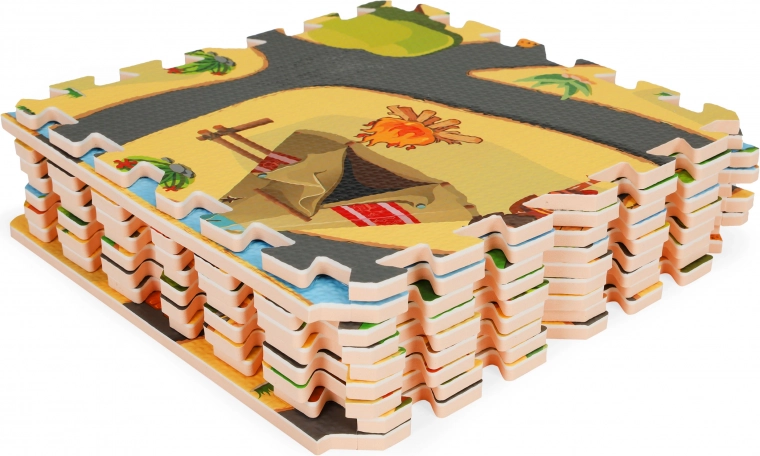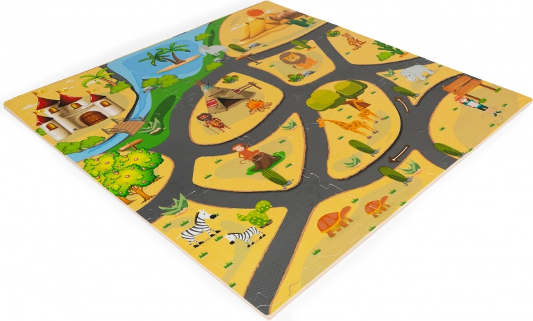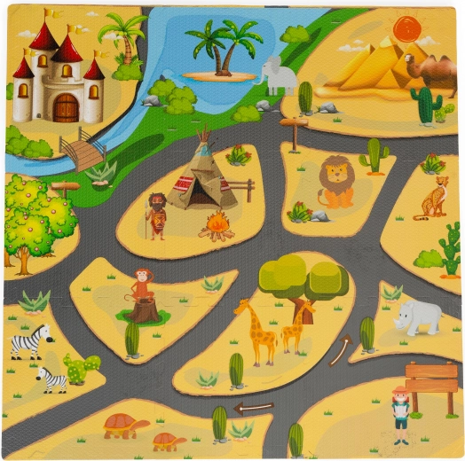 Een kleurrijke schuimrubberen speelmat met safarimotief creëert een veilig en speels plekje voor dagelijks plezier. De delen passen in elkaar als een puzzel, zodat je eenvoudig elke gewenste vorm maakt. De mat is van gecertificeerd EVA-materiaal, heeft een antisliptextuur en een comfortabele dikte van 0,9 cm die vallen dempt en tegen kou isoleert. Makkelijk schoon te maken – gewoon afnemen met een vochtige doek, veilig voor kinderen en ideaal om te spelen, kruipen en de eerste stapjes te zetten.