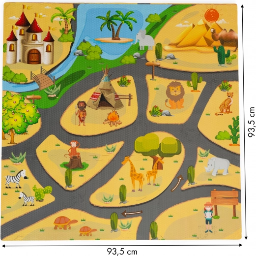 De schuimrubberen speelmat safari is een geweldige oplossing voor elke kinderkamer. Negen grote delen met vrolijke dierengrafiek creëren een zachte en veilige ondergrond om te spelen en te rusten. Dankzij het puzzelprincipe pas je formaat en vorm aan de ruimte aan – van een vierkant tot uitgebreide banen.