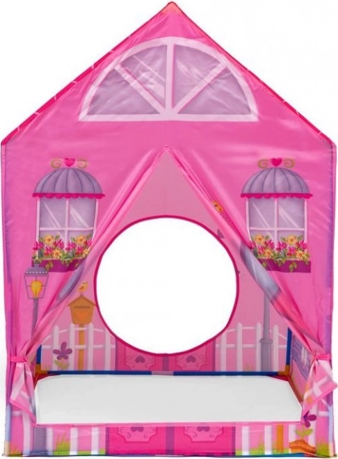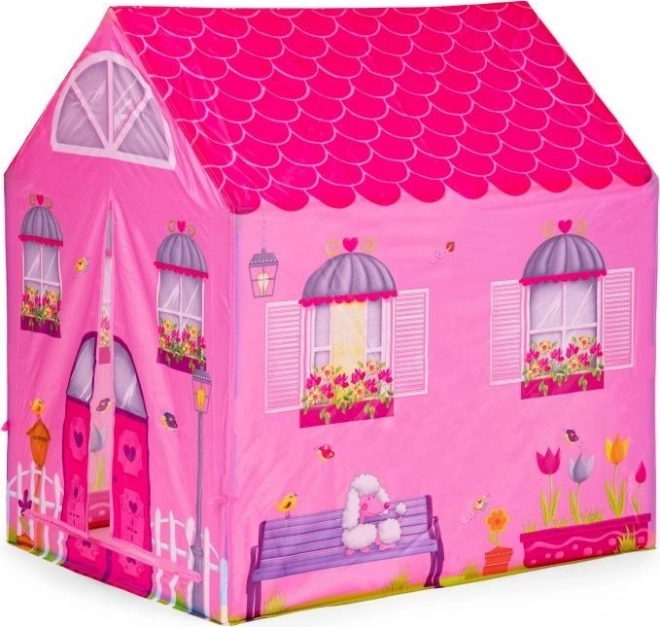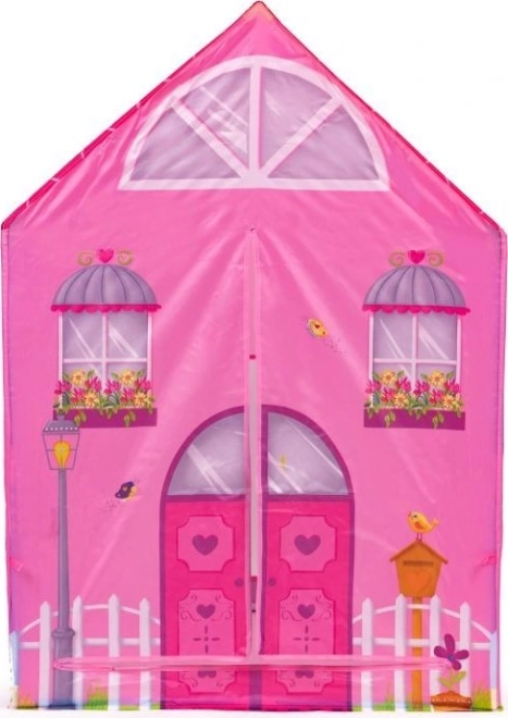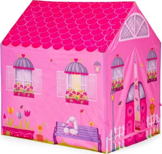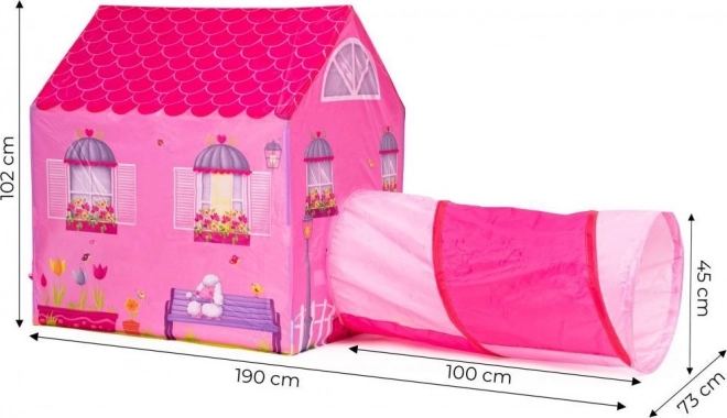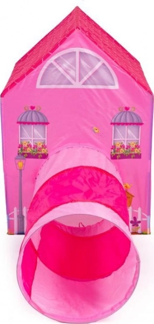 Kindertent met tunnel met het motief van een roze huisje.